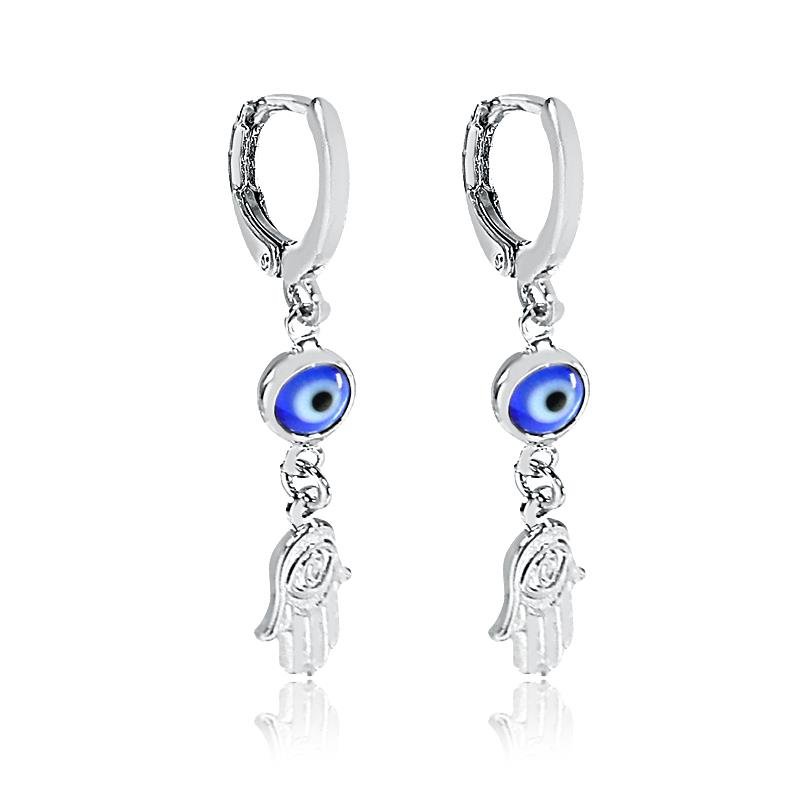 Brinco de argola redonda com pingentes mão de fátima em olho gego resinado.Os brincos são peças vendáveis. Toda a revendedora de semijoias sabe que os brincos são os mais queridinhos de suas clientes. É por isso a importância de ter vários modelos.