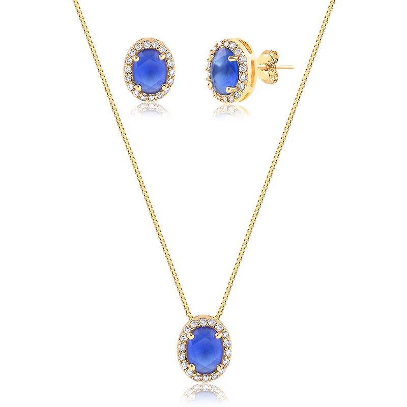 Conjunto adulto composto por um par de brincos em formato oval com detalhes em zircônia cravejada e uma corrente veneziana com pingente oval com detalhes em zircônia cravejada.Os conjuntos em semijoias são peças clássicas em um mostruário de revendedora.